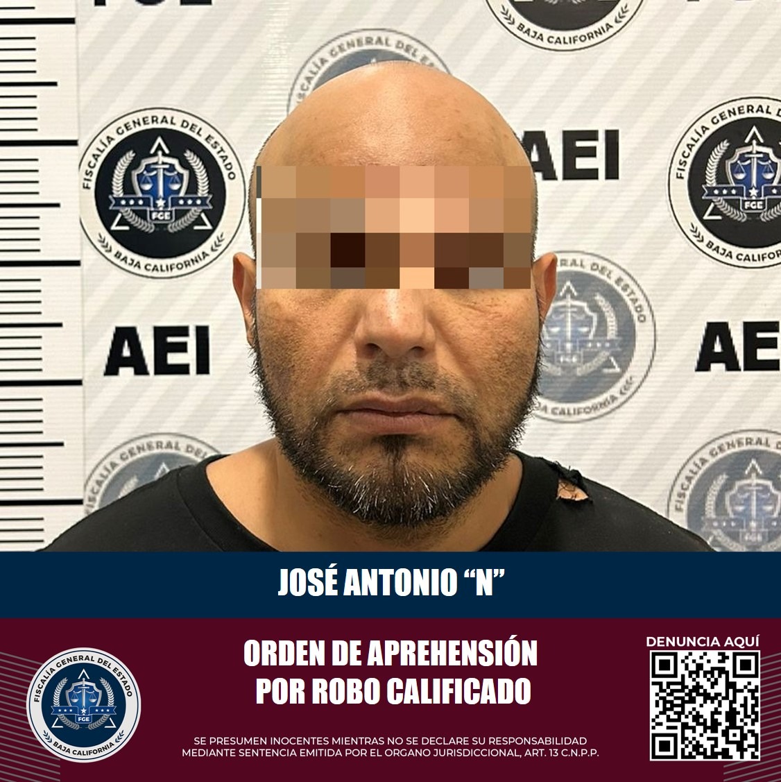 TIJUANA, BAJA CALIFORNIA, A 5 DE ABRIL DE 2024.- Derivado de una investigación realizada por la Fiscalía General del Estado (FGE) por el delito de robo calificado a comercio abierto al público ejecutado de noche, se obtuvo una orden de aprehensión en contra de José Antonio “N”. Agentes estatales de investigación, tras cumplimentar dicho mandato el pasado 1 de abril, lo pusieron a disposición de la autoridad judicial que ordenó su captura para que responda por el ilícito que se le imputa.